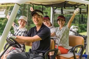 カートの利用: カートを使用する場合はコース内の指定区域(カートパス)を走行し、フェアウェイやラフには乗り入れないようにします。同じ組でカートを利用するときは順番を決め、譲り合って利用しましょう。